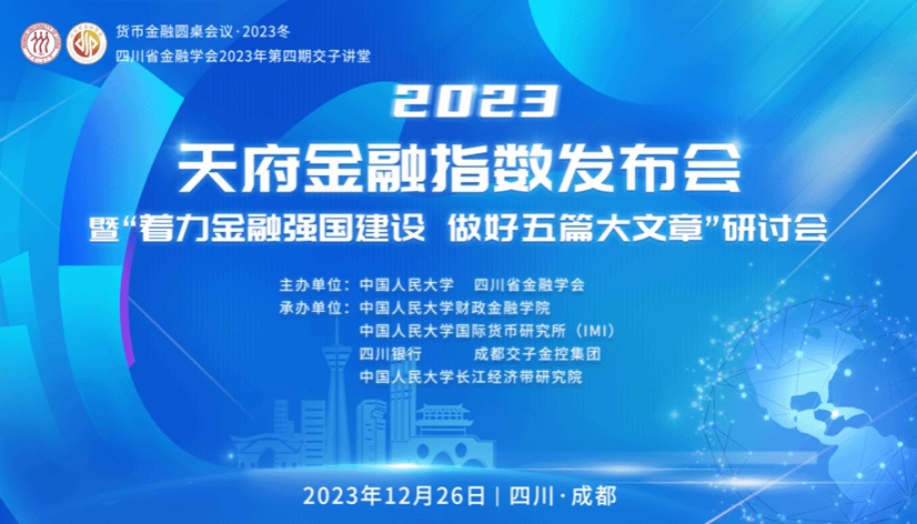 2023年12月26日,由中国人民大学和四川省金融学会联合主办的“2023天府金融指数”发布会暨“着力金融强国建设,做好五篇大文章”研讨会在四川成都举办。本次会议同时也是“货币金融圆桌会议·2023冬”和四川省金融学会2023年第四期交子讲堂,由中国人民大学财政金融学院、中国人民大学国际货币研究所(IMI)、四川银行、成都交子金控集团和中国人民大学长江经济带研究院联合承办。