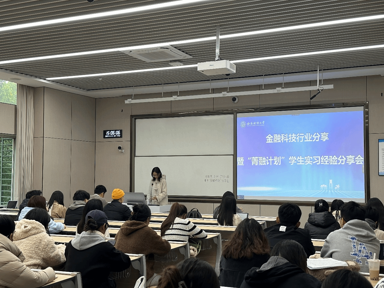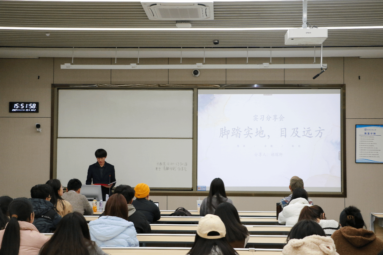 分享环节,2022级金融学专业本科生鲜珂晗和2023级金融学(证券与期货方向)专业本科生祁琛轩分别分享了在中国银行四川分行和宜宾发展集团的实习经验和深刻反思,为在场的同学们提供了宝贵的职业规划和行业洞察,激发了大家对未来实习和就业的热情与期待。