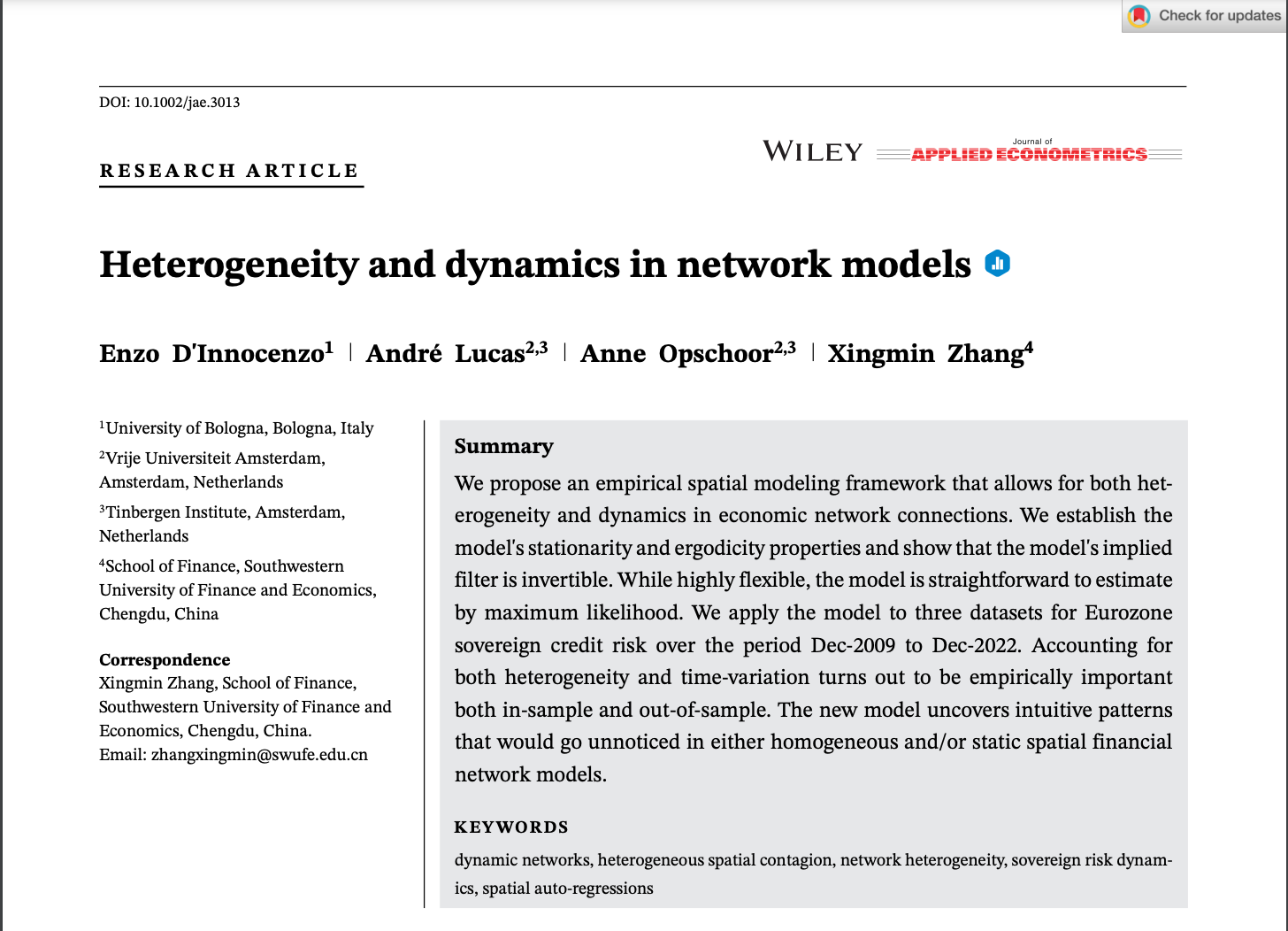 近日,金融学院张兴敏副教授(通讯作者)与University of Bologna的Enzo D'Innocenzo助理教授、Vrije Universiteit Amsterdam和Tinbergen Institute的André Lucas教授、Anne Opschoor副教授的合作论文“Heterogeneity and dynamics in network models”在国际著名经济金融类期Journal of Applied Econometrics在线发表。