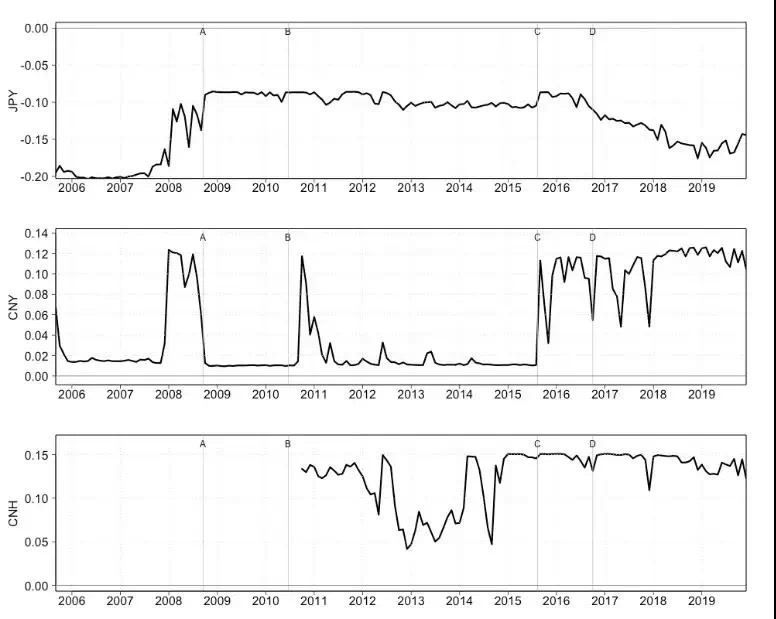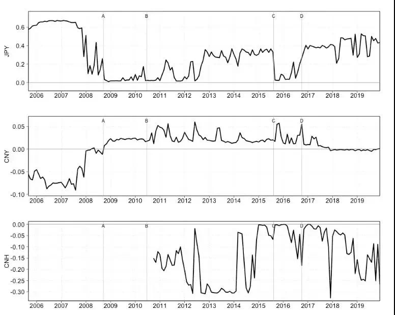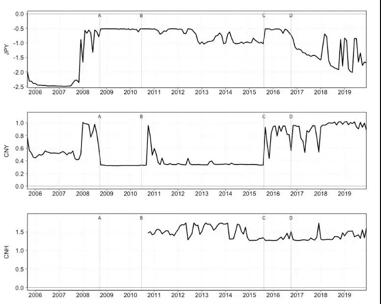 由于日元被认为是最安全的避险货币(Fatum and Yamamoto, 2016),本文还通过比较人民币与日元在国际金融风险变大或出现极端风险时的表现,来判断人民币是否是国际避险货币。