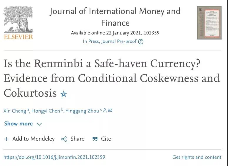 yl7703永利集团中国金融研究中心教师程欣与合作者所作论文在《Journal of International Money and Finance》发表文章“Is the Renminbi Safe-haven Currency? Evidence from Conditional Coskewness and Cokurtosis”,探讨人民币的避险属性。