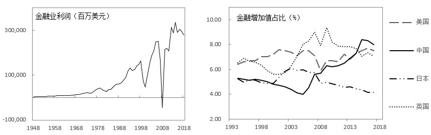 金融化进程的重要特征之一就是金融业利润上升。自上世纪70年代开始,金融行业的利润呈几何级数增长(图1)。从1973年到2018年,美国GDP增长约14.2倍,而金融业利润增长了超过100倍;全球GDP增长约16倍,而存款性货币银行资产增加了超过40倍。近年来,“金融让利”成为金融支持实体经济发展的重要手段。从国家政策和社会舆论来看,“金融让利”得到了广泛支持,但在理论研究领域,却鲜有严谨的理论分析和实证证据。