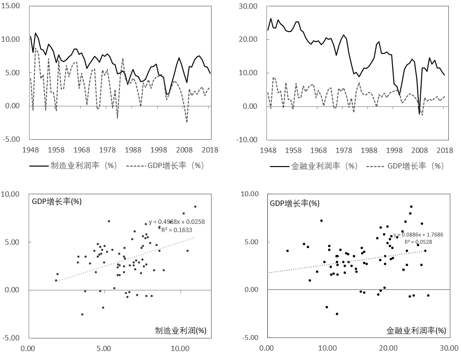 从中国和美国的数据来看,制造业和工业企业的利润率与经济增长呈显著的正相关,但金融企业的利润率与经济增长没有明显的线性关系,甚至有时候表现出负向关系(图2、图3)。