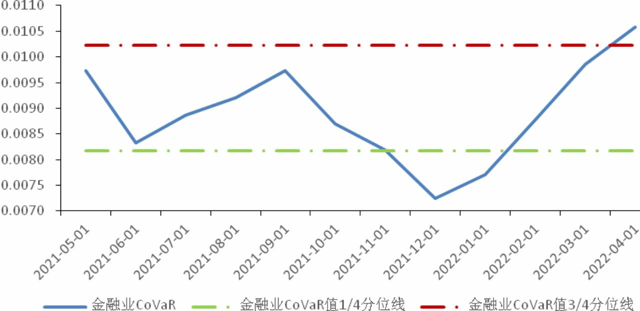 相比上月,本月金融业CoVaR指数均值环比上升7.34%,风险水平有较明显的上升。本月末,CoVaR指数在月末完成了对历史3/4分位风险警戒线的又一次穿越,相比2022年3月的风险水平整体有所上升。风险水平上升的主要原因俄乌冲突谈判阶段性破裂、国内区域性疫情持续和大宗商品价格继续走高导致的滞胀风险,从而冲击全球贸易和宏观经济稳定,同时国内疫情在局部地区出现爆发增长,拖累经济正常增长,进而对国内金融机构的资产质量和资金配置效率造成负面影响,不利于金融机构系统性风险缓解。