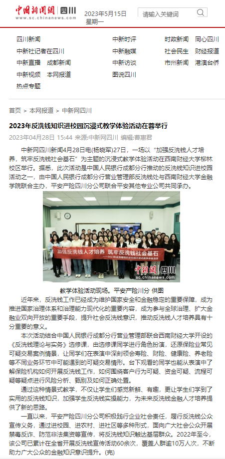 近日,《中新网四川》刊登了《2023年反洗钱知识进校园沉浸式教学体验活动在蓉举行》一文,报道我院与中国人民银行成都分行营业管理部反洗钱处,在我校柳林校区联合主办的一场以“加强反洗钱人才培养,筑牢反洗钱社会基石”为主题的沉浸式教学体验活动。