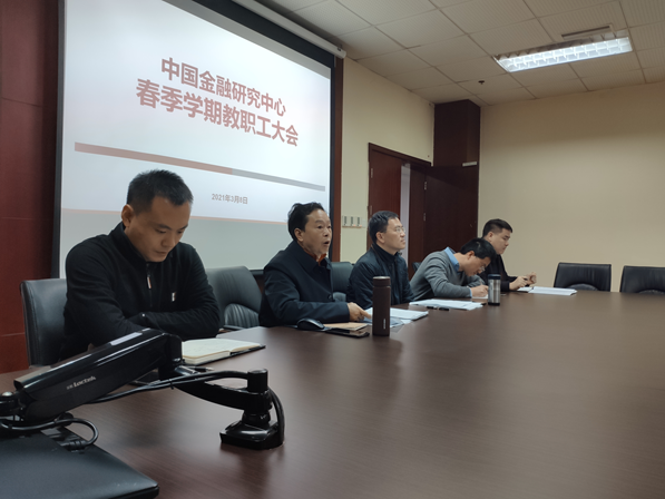 On the morning of March 8, the Institute of Chinese Financial Studies of SWUFE(ICFS) held its first faculty meeting of the spring semester. ICFS leadership team and all faculty members attended the meeting. LI Dayong, Secretary of the General Party Branch, presided over the meeting. Firstly, Li informed the meeting of democratic meeting of the leading group in 2020. After that, Li focused on conveying the principles of middle-level cadres study meeting of SWUFE spring semester in 2021 in detail to all the faculty and staff referring to chairman ZHAO Dewu's special report and President ZHUO Zhi's annual work arrangement. Lastly, Director WANG Qing made arrangements for the annual work priorities of ICFS, such as talent cultivation, scientific research and discipline construction, based on the "Proposal of the Committee of the CPC Southwest University of Finance and Economics on the 14th Five-Year Plan", and the key points of the work of SWUFE in 2021.